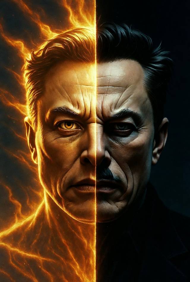 *좌측은 인류에게 불을 전해 준 프로메테우스 일론 머스크를 나타 낸다. 우측은 선동가, 시가꾼, 노동착취의 사악한 일론 머스크를 나타 낸다. 아이러니 하게도 다른 인공지능은 실존 인물 이미지 생성을 거부하여 Grok으로 생성 하였다.